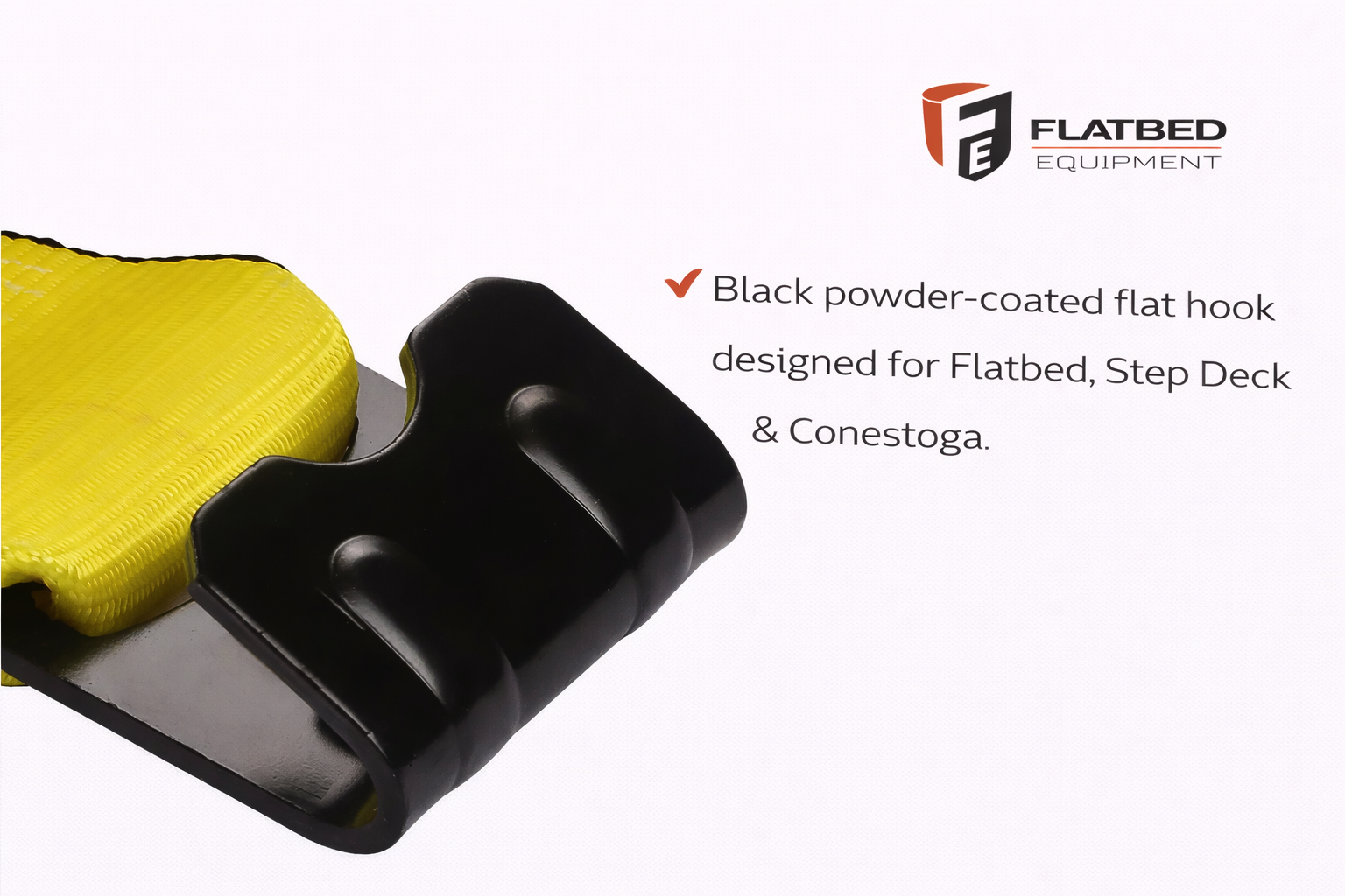 Β The heat-treated flat hook features a wide contact area for improved load force distribution and secure engagement with rub rails and trailer edges.